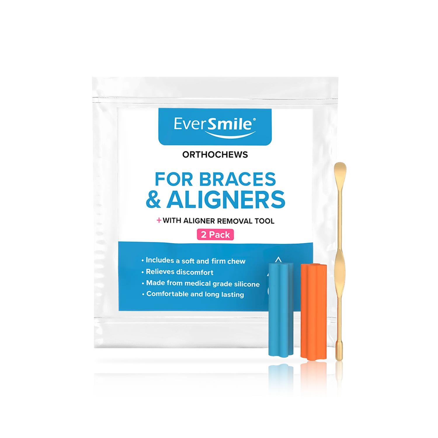 The EverSmile OrthoChews are soft and firm chews designed to relieve discomfort from tight-fitting aligners, braces, or retainers while ensuring a snug fit for faster treatment progress. Made from high-quality, medical-grade silicone, these chews are hypoallergenic, latex-free, and long-lasting. The unique quatrefoil shape ensures maximum grip, preventing slipping while in use. Includes a dual-end removal tool for effortless aligner removal and precise chew placement.